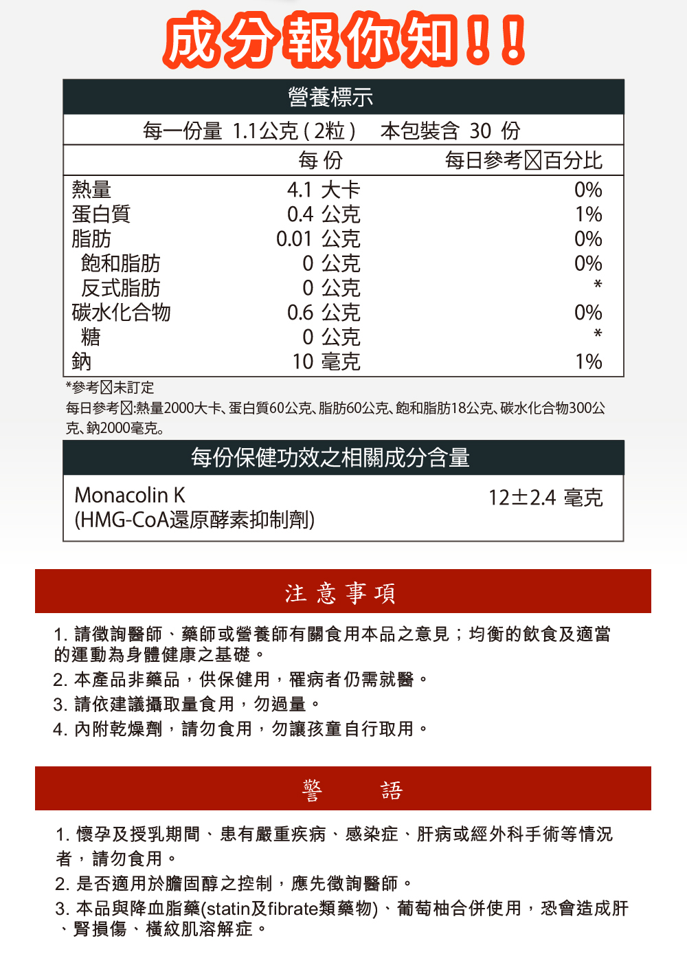 ✅每粒含有效成分MonacolinK (HMG-CoA還原酵素抑制劑) 6±1.2毫克