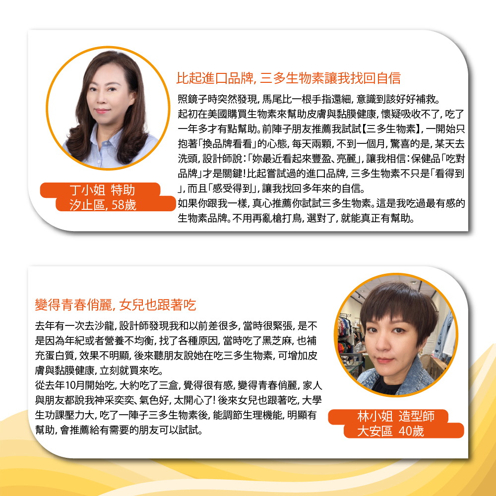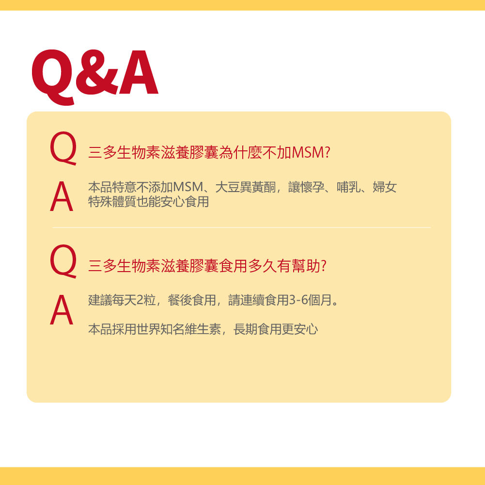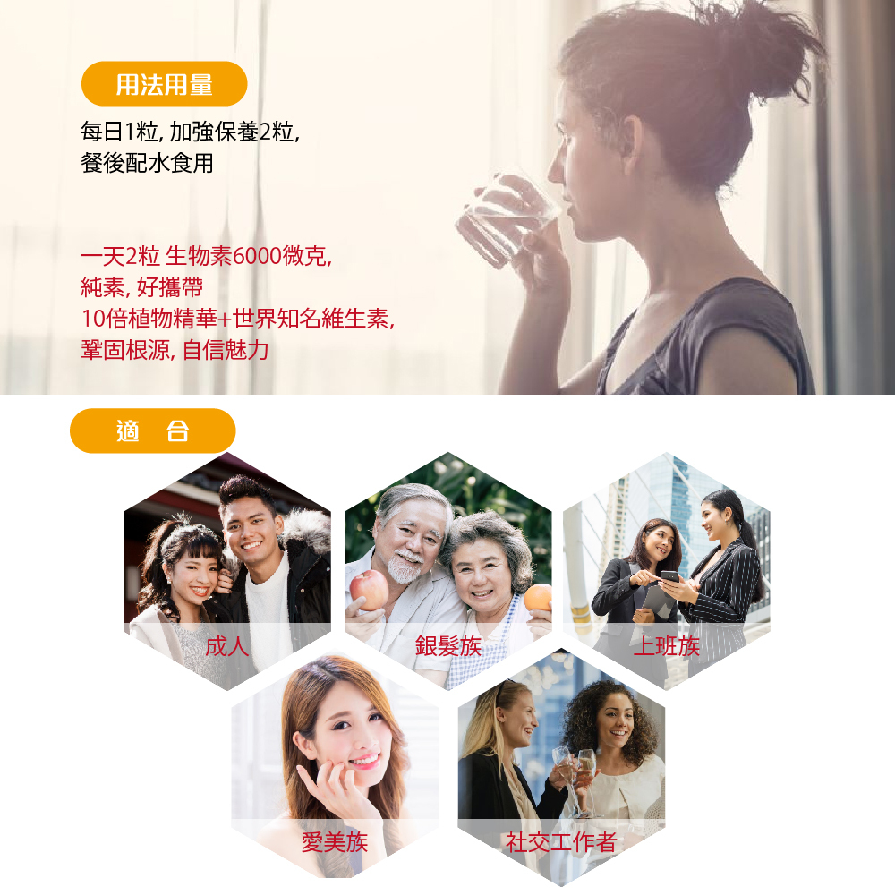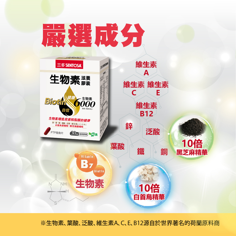 | 一天2粒 生物素6000微克,純素,好攜帶 ■根本滋養:生物素、泛酸、維生素A可增進皮膚和黏膜健康。 ■密集保護:鋅可增進皮膚健康,維生素C可促進膠原蛋白形成,維生素E能抗氧化。 |