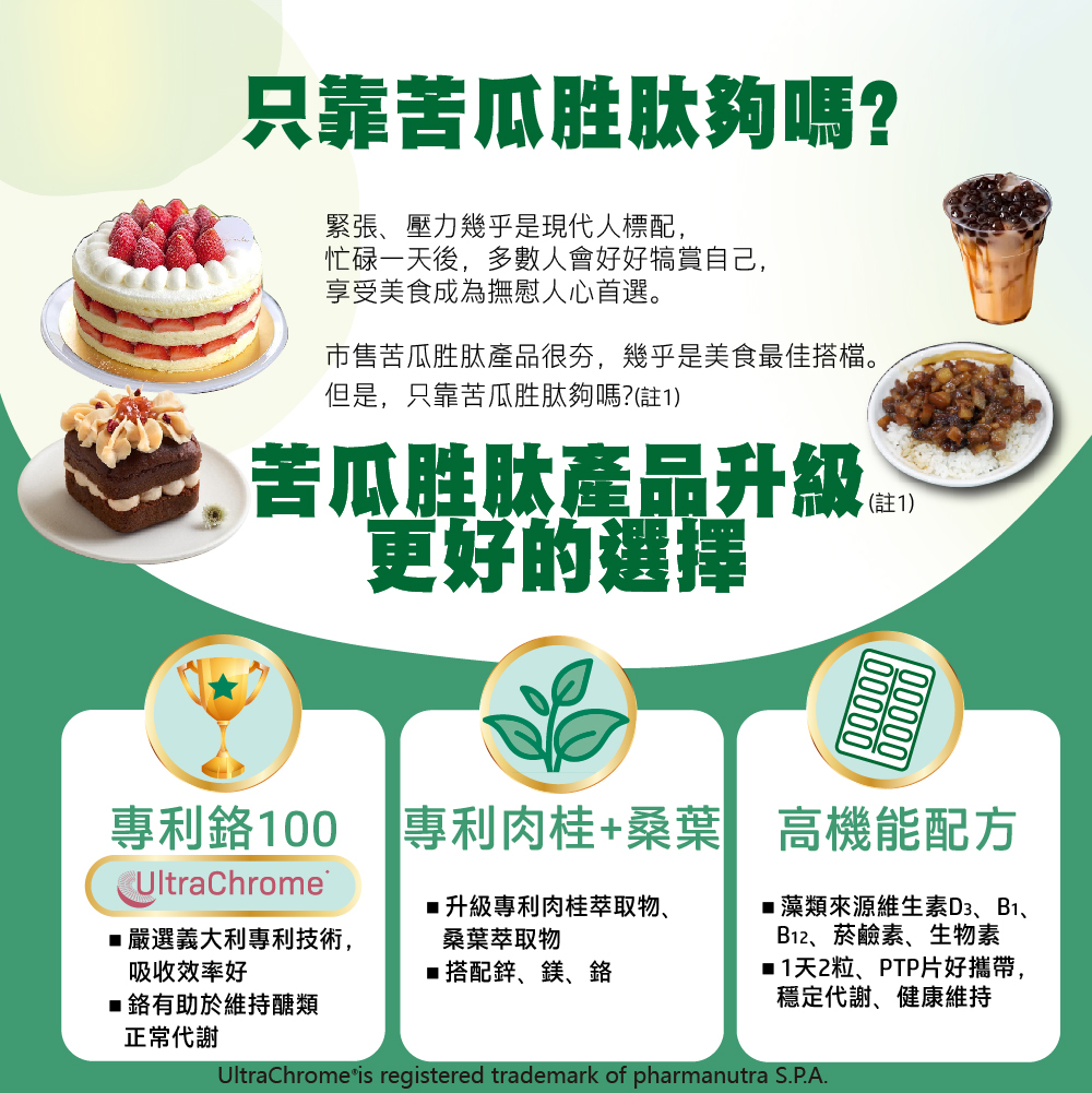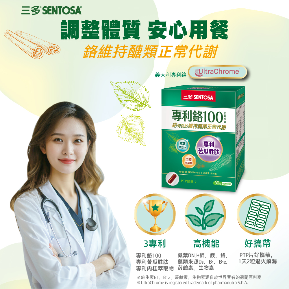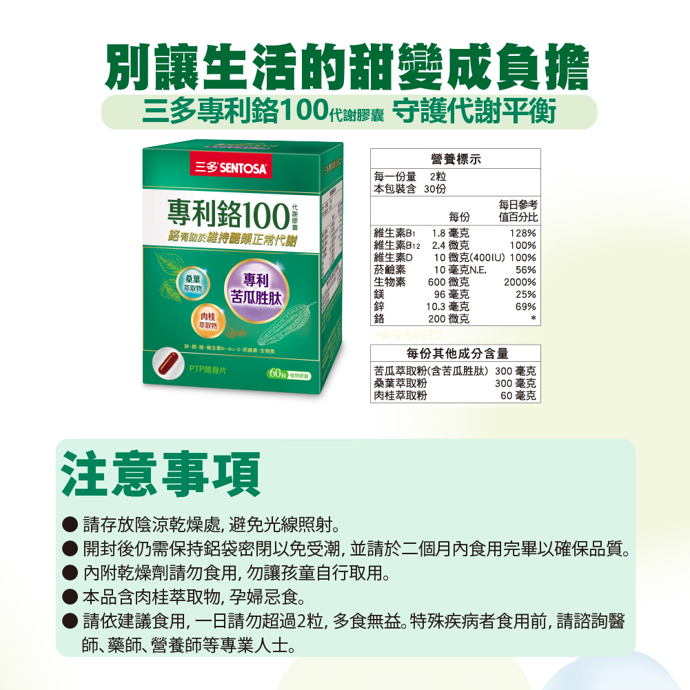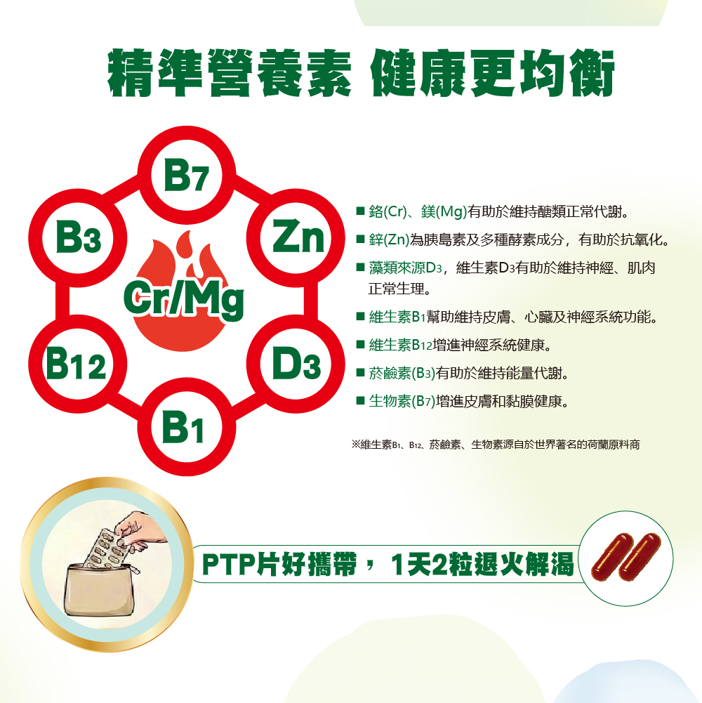 | 專利鉻有助於維持醣類正常代謝,調整體質,安心用餐 .植萃精華:專利苦瓜胜肽、桑葉萃取物、肉桂萃取物,解渴、降火氣。.穩定代謝(註1):鉻、鎂有助於維持醣類正常代謝。鋅為胰島素及多種酵素成分,有助於抗氧化。 藻類來源D3,維生素D有助於維持神經、肌肉正常生理;維生素B1幫助維持皮膚、心臟及神經系統功能; 維生素B12增進神經系統健康;菸鹼素有助於維持能量代謝;生物素增進皮膚和黏膜健康。 .攜帶方便:PTP片好攜帶,1天2粒退火解渴 ※維生素B1、B12、菸鹼素、生物素源自於世界著名的荷蘭原料商 註1: 鉻有助於維持醣類正常代謝 |