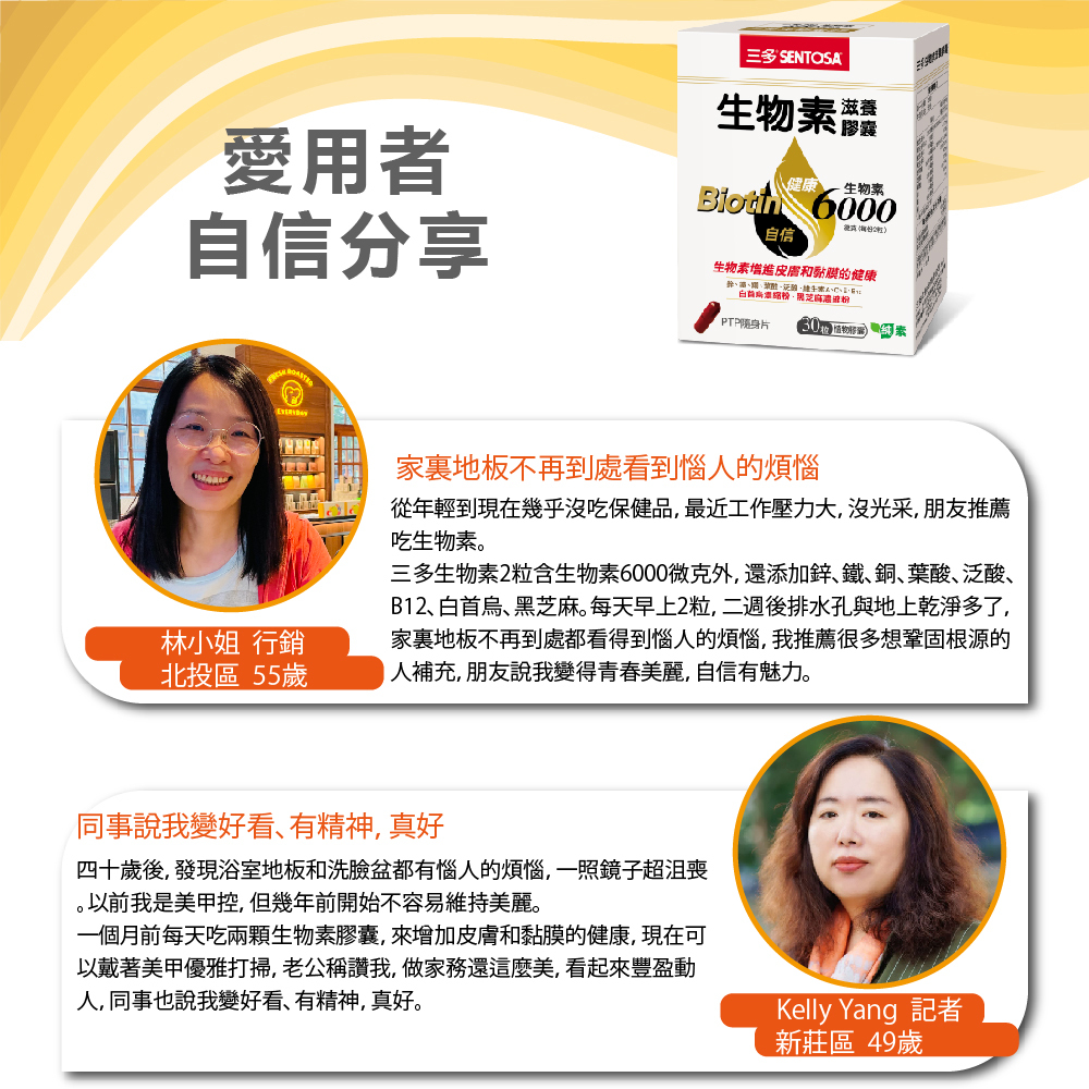 | 一天2粒 生物素6000微克,純素,好攜帶 ■根本滋養:生物素、泛酸、維生素A可增進皮膚和黏膜健康。 ■密集保護:鋅可增進皮膚健康,維生素C可促進膠原蛋白形成,維生素E能抗氧化。 |